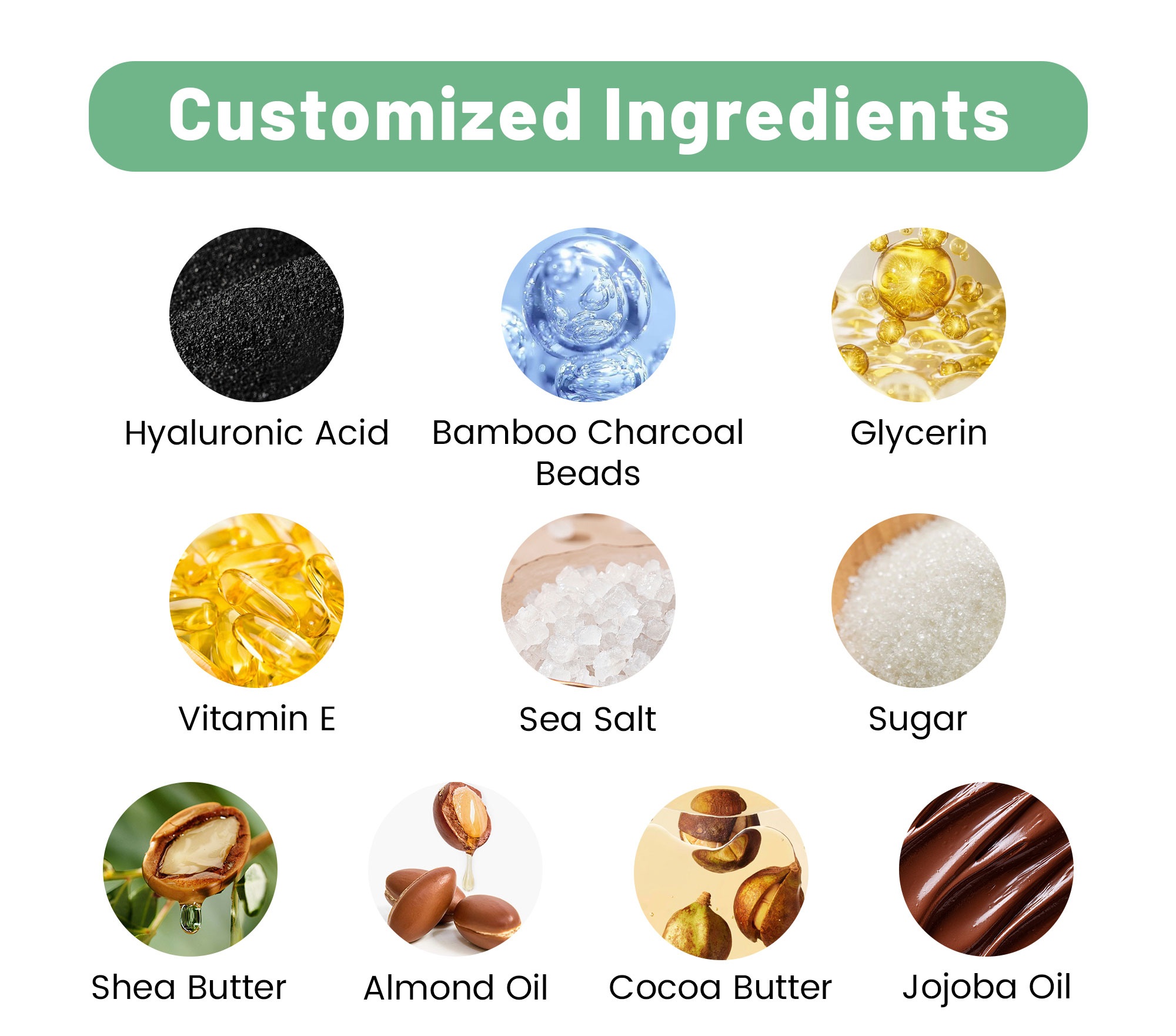 Fine Sugar Crystals, Brown Sugar, Coconut Oil, Shea Butter, Peppermint Oil, Spearmint Oil, Vanilla Extract, Jojoba Oil, Vitamin E, Aloe Vera Gel, Grapeseed Extract