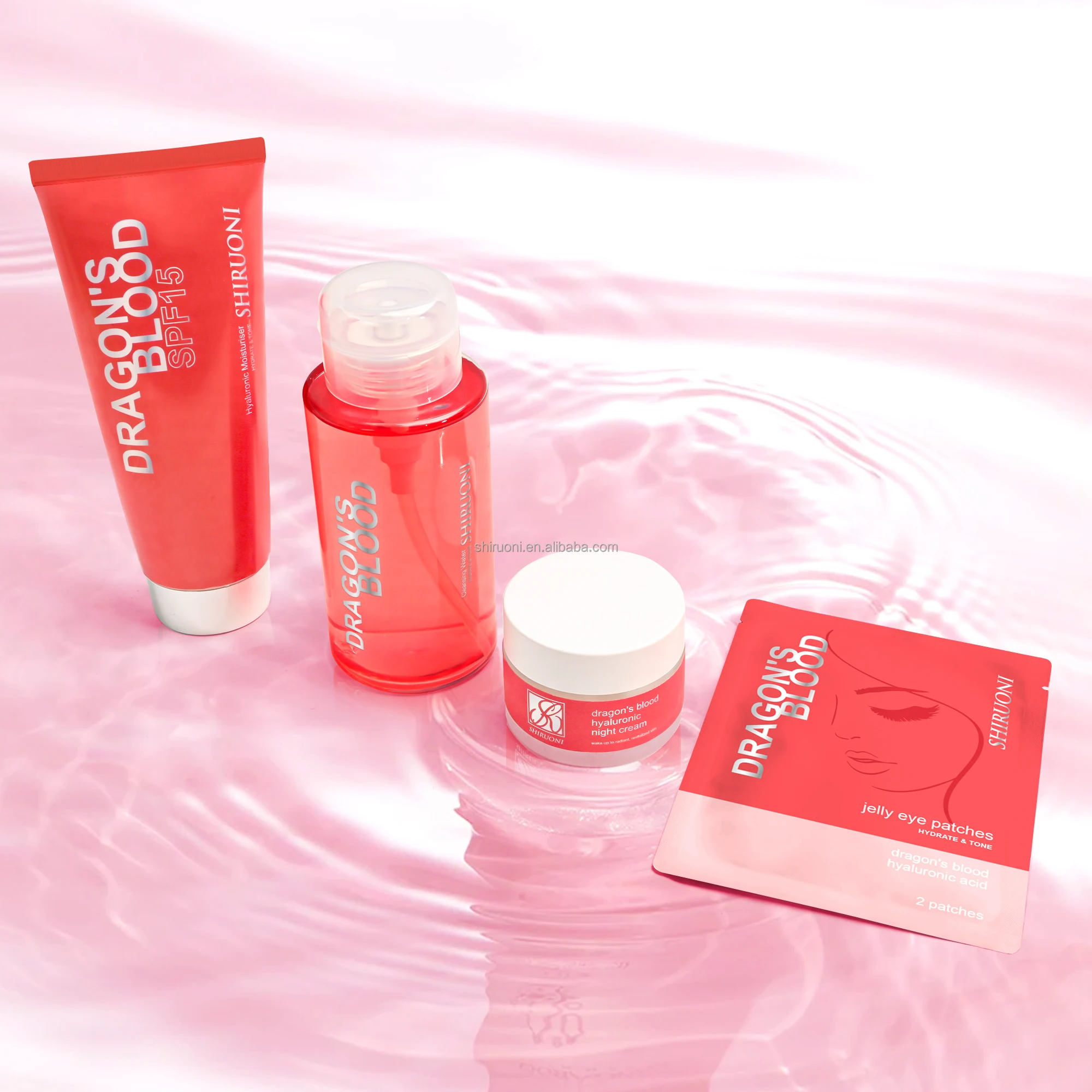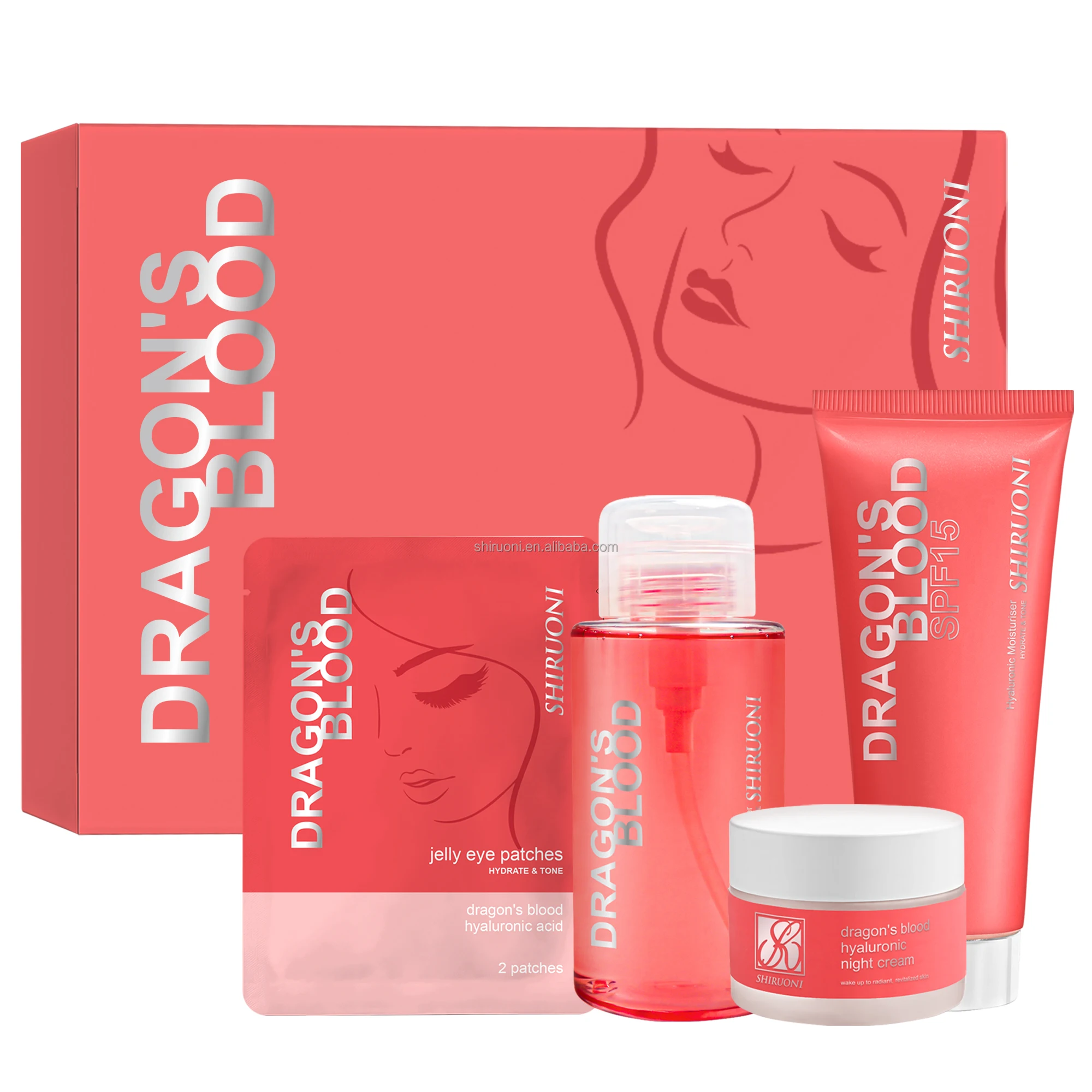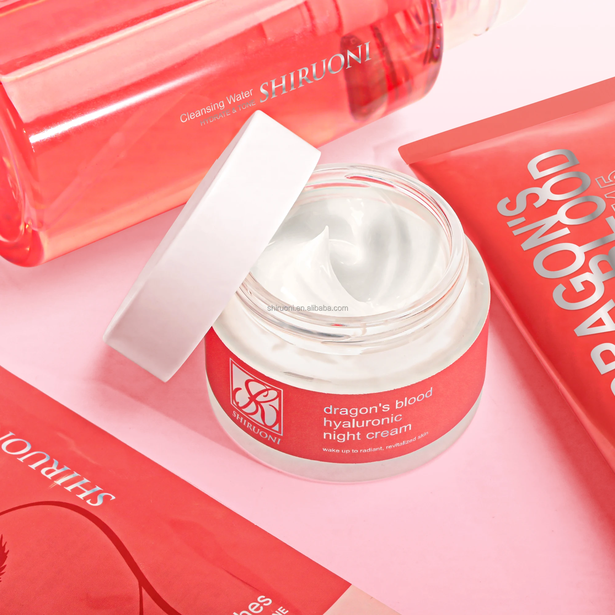 Custom anti-aging skincare set with eye patches, night cream, sunscreen, and cleanser. Infused with Dragon's Blood for skin brightening, hydration, and deep cleansing. Ideal for private label & wholesale skincare.
