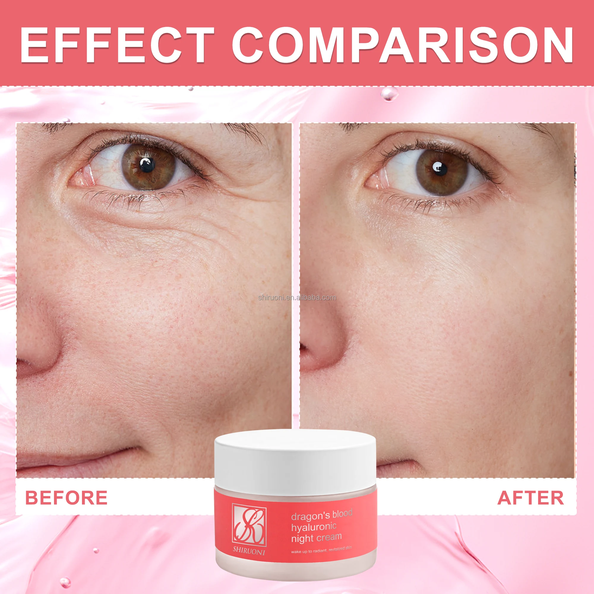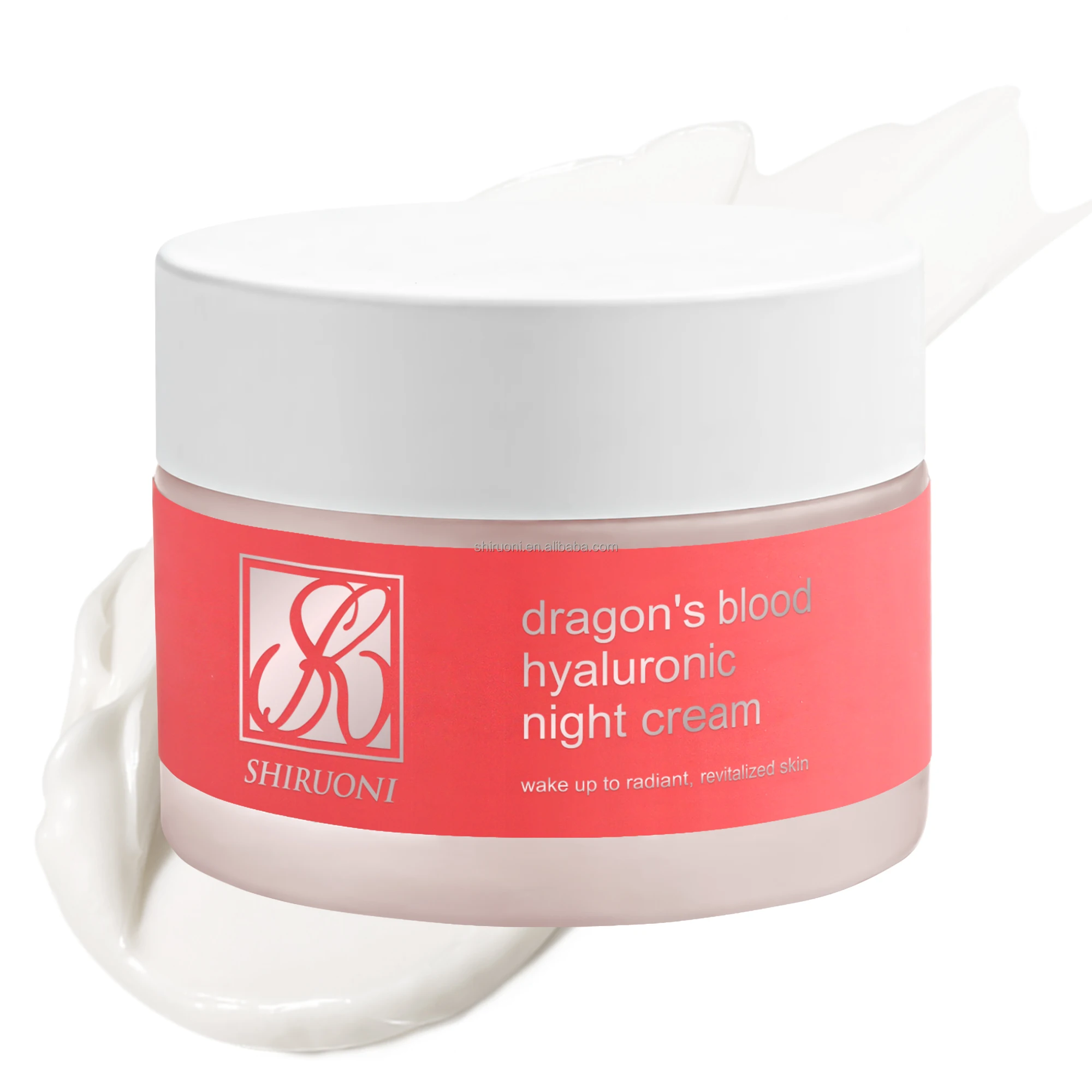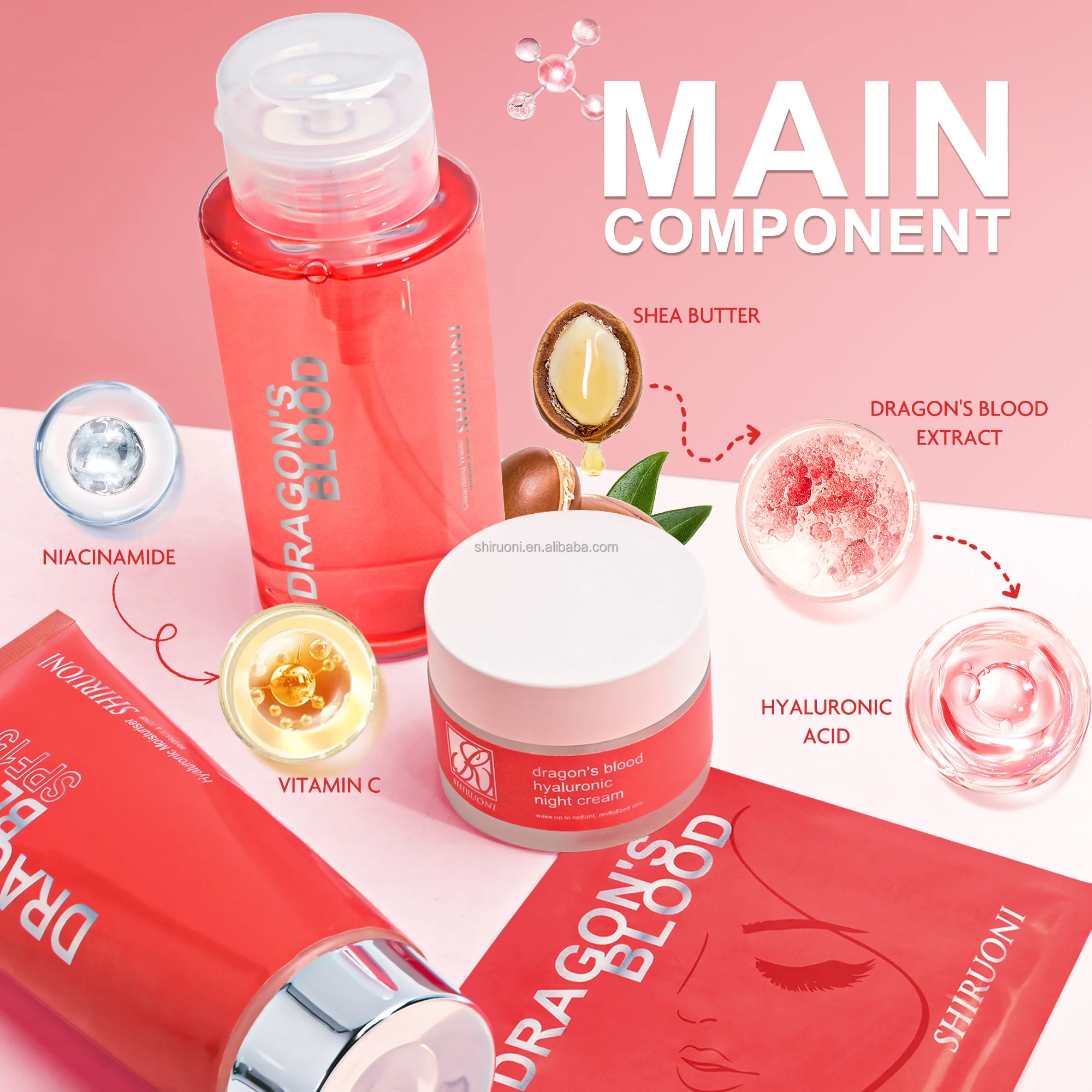 Custom anti-aging skincare set with eye patches, night cream, sunscreen, and cleanser. Infused with Dragon's Blood for skin brightening, hydration, and deep cleansing. Ideal for private label & wholesale skincare.